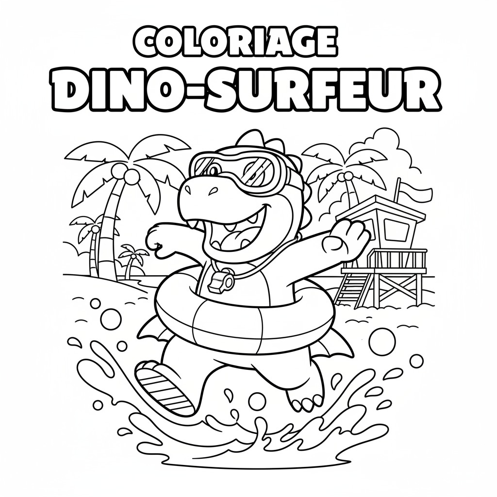 N'oubliez pas les petits détails qui font toute la différence comme son sifflet jaune et sa bouée de sauvetage qu'il porte souvent avec lui. Ces éléments apportent des touches de couleurs primaires qui équilibrent l'ensemble de la composition. Vous pouvez encourager votre enfant à utiliser des feutres pour les contours afin de bien délimiter les zones et des crayons de bois pour le remplissage afin de pouvoir faire des dégradés subtils sur la peau du dinosaure.