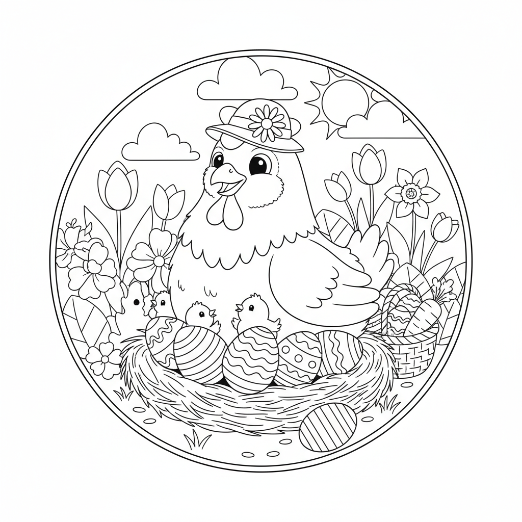 Nous avons également inclus des scènes où la poule interagit avec d'autres éléments de la fête comme des paniers tressés, des fleurs de printemps comme les jonquilles, ou des rubans décoratifs. Cette diversité permet de ne jamais s'ennuyer et de varier les plaisirs à chaque nouvelle page imprimée. Chaque coloriage est une nouvelle aventure visuelle qui attend d'être sublimée par le talent de vos enfants.